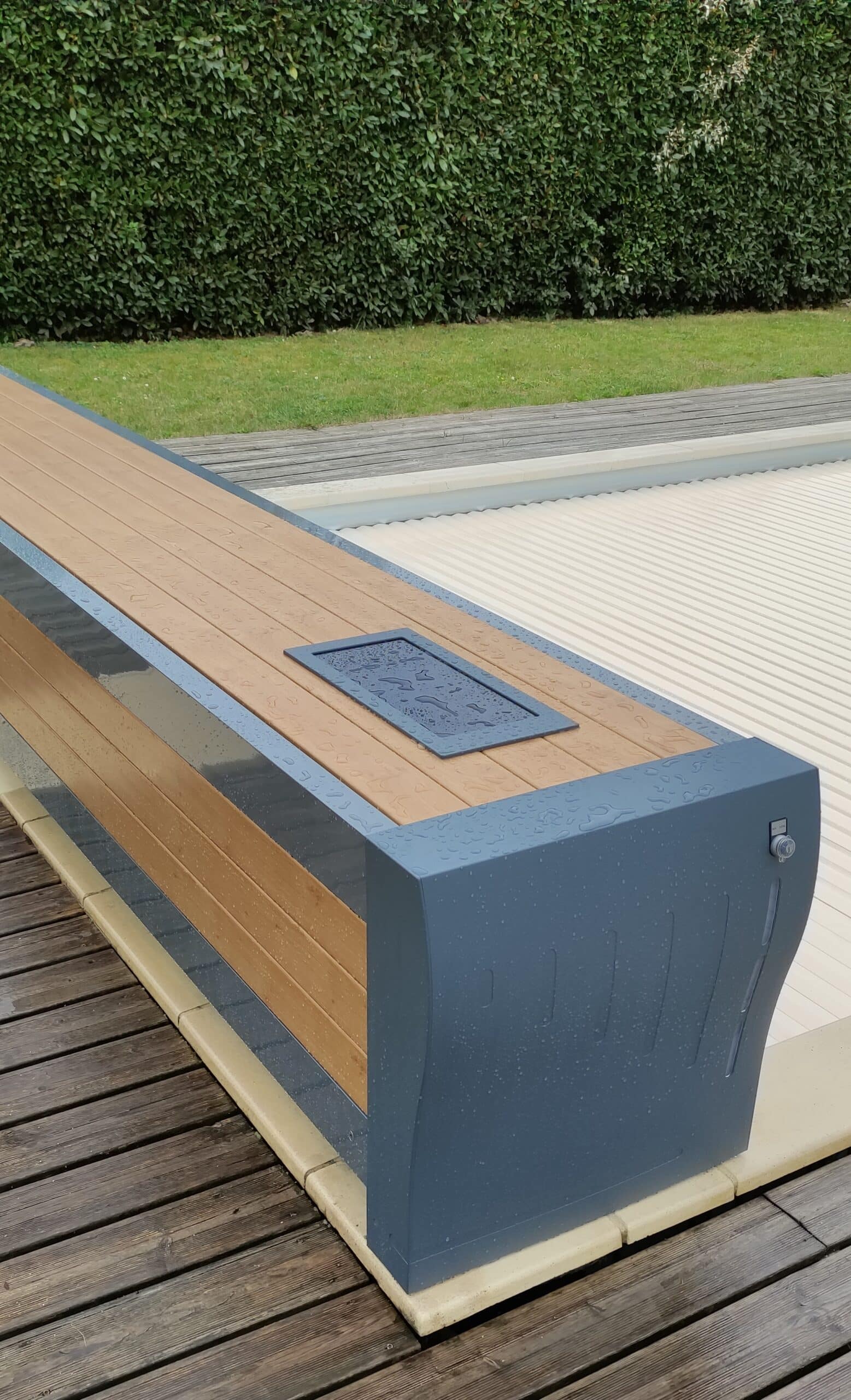 Pour parfaire la finition de votre couverture de piscine, Volée d’O vous propose l’habillage du banc avec des lisses en bois exotique ou en PVC ou PVC imitations BOIS :