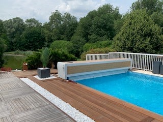 Nos couvertures à lames rigide PVC permettent de garder la chaleur de l’eau la nuit et limitent l’évaporation.